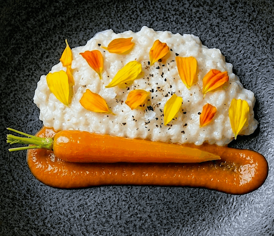 Base a un lado de arroz cremoso, en un lado la reducción de Zanahorias y una zanahoria encima, incorpora unos pétalos de flores comestibles y un poco de pimienta recién molida.