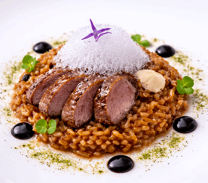 Base de arroz en el centro (molde o natural). Liebre trinchada encima. Un hilo de fondo reducido (tipo demi-glace). Polvo de salvia y espinaca. Puntos de alioli de ajo negro y asado (enlace abajo en notas).