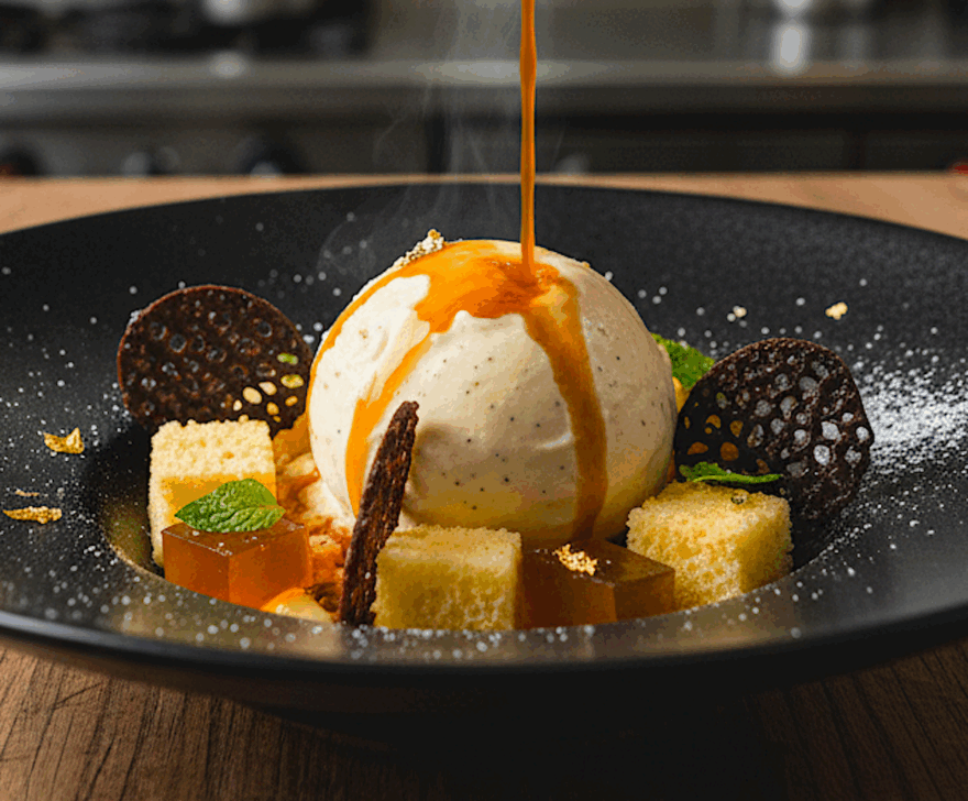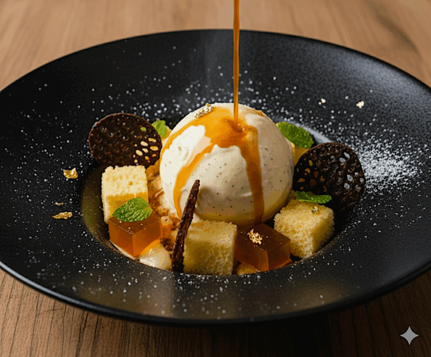 Decora con hojas de menta y pan de oro comestible o, hilos finos de caramelo o sirope de café para realzar brillo.