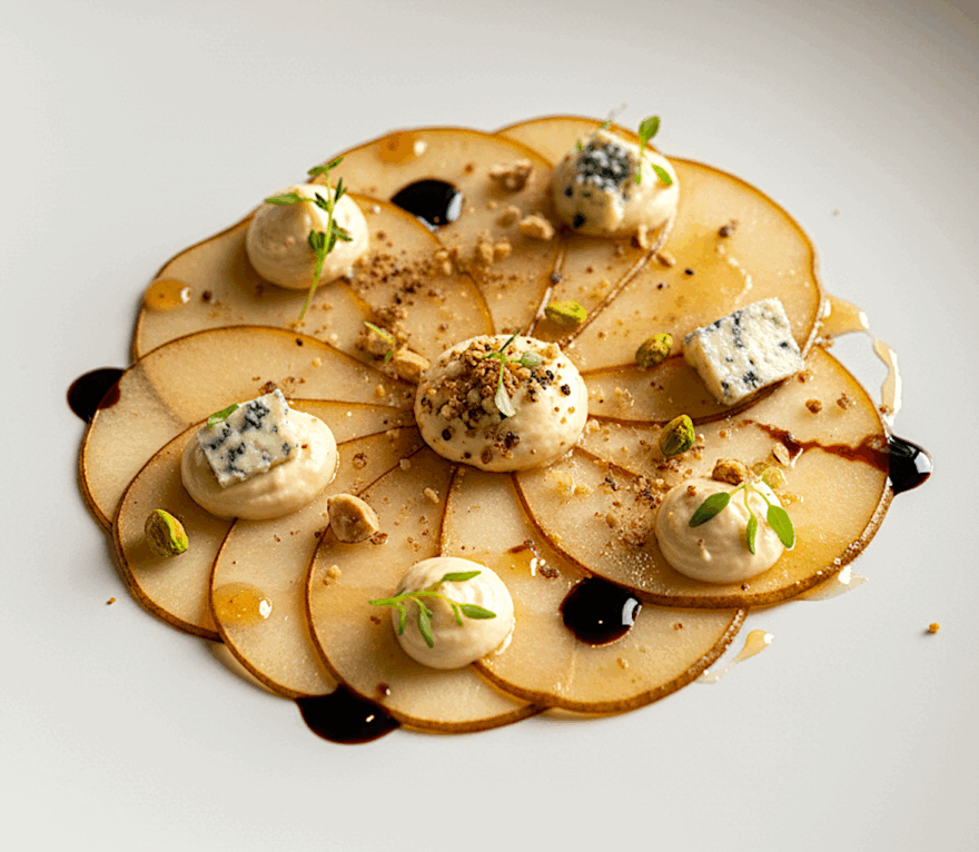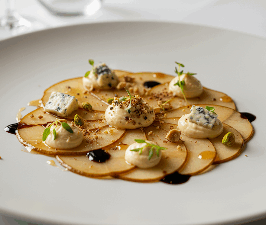 Sirve las peras templadas (35–40 °C) y la crema fría para un contraste térmico elegante.