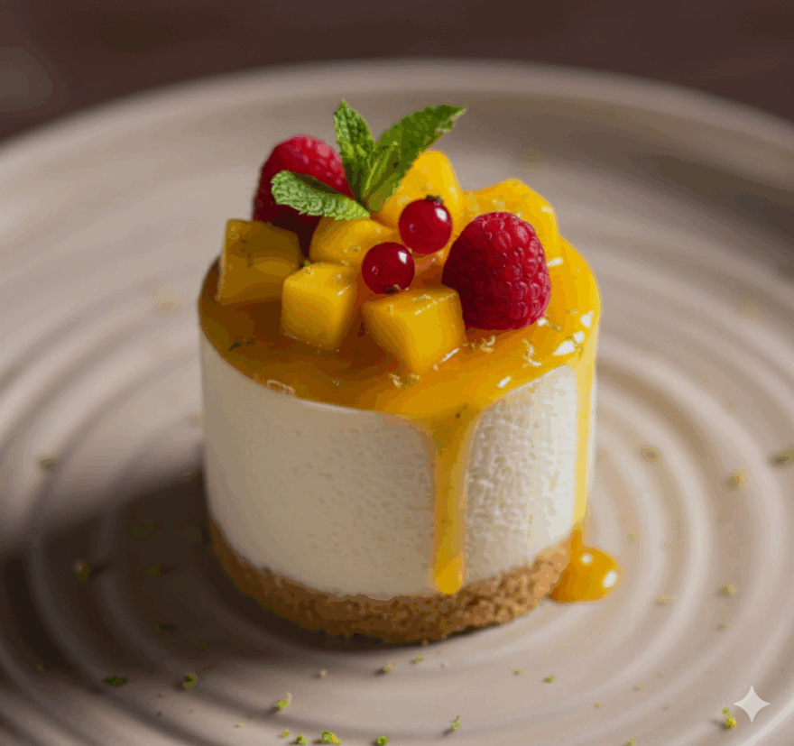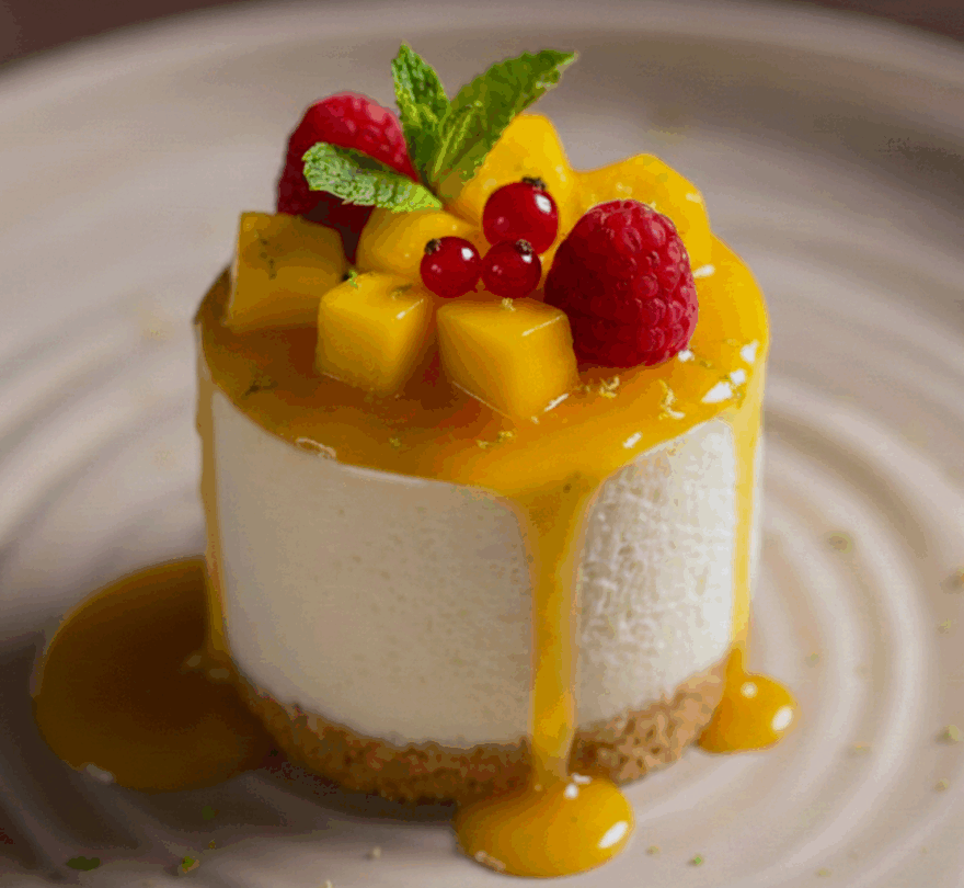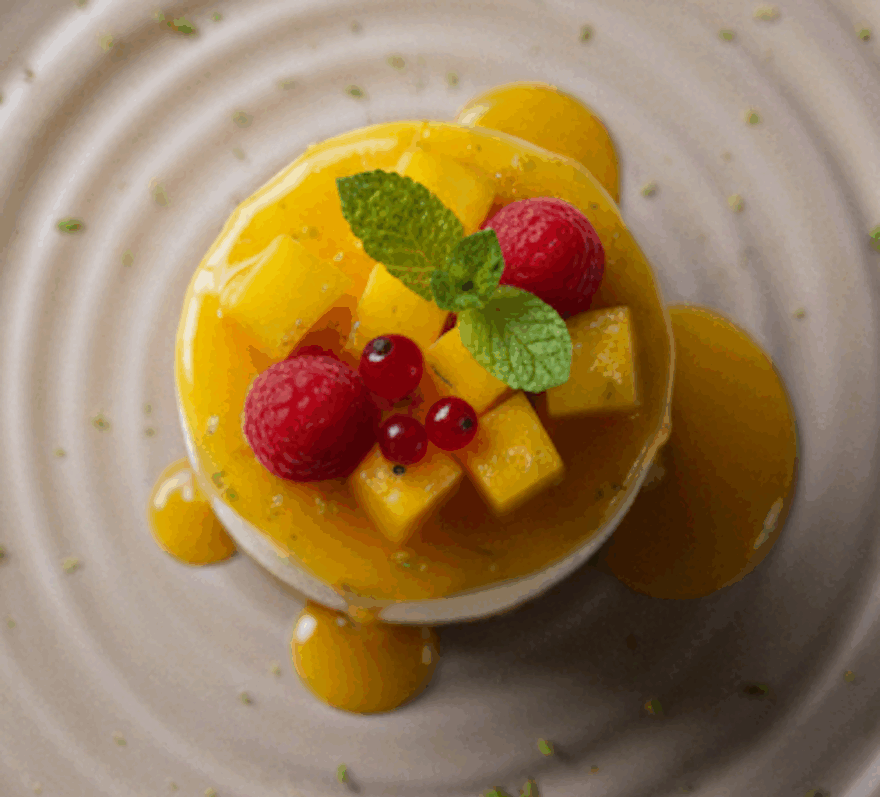 Desmoldar en un plato, poner encima las grosellas, la menta, los dados de mango, volver a salsear con el puré tropical. Espolvorear ralladura de lima-limón.