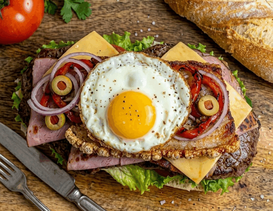 Pan inferior lechuga y tomate, la carne con queso y jamón, la panceta crujiente y la cebolla y pimiento salteados (cebolla cruda o pimientos asados en conserva), el huevo frito, las aceitunas y por último el pan superior. A comer!