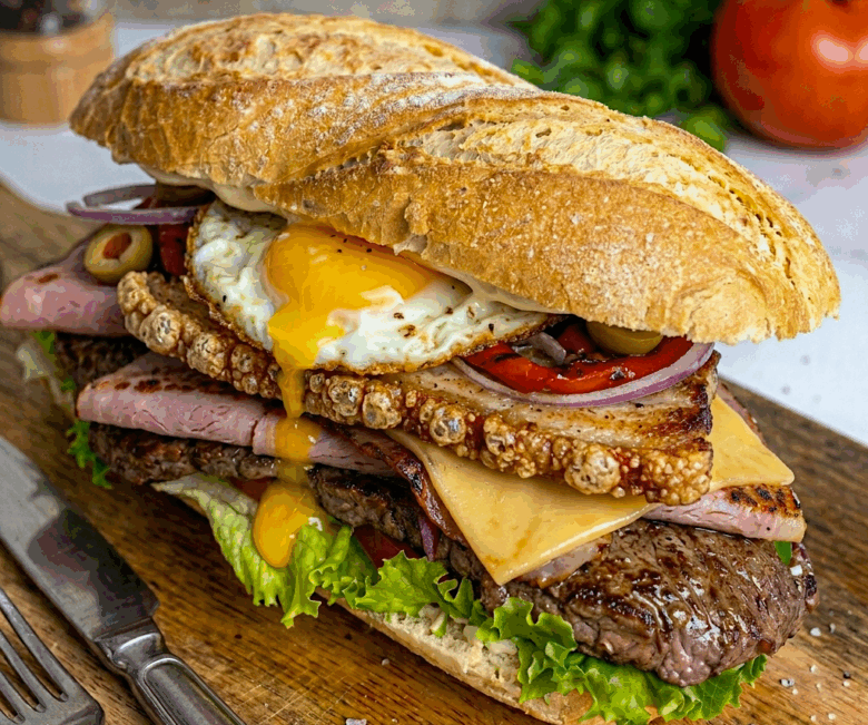 Pan inferior lechuga y tomate, la carne con queso y jamón, la panceta crujiente y la cebolla y pimiento salteados (cebolla cruda o pimientos asados en conserva), el huevo frito, las aceitunas y por último el pan superior. A comer!