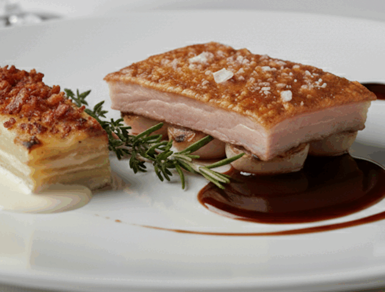 Cochinillo Crujiente con Chalotas Caramelizadas y Pastel de Patata