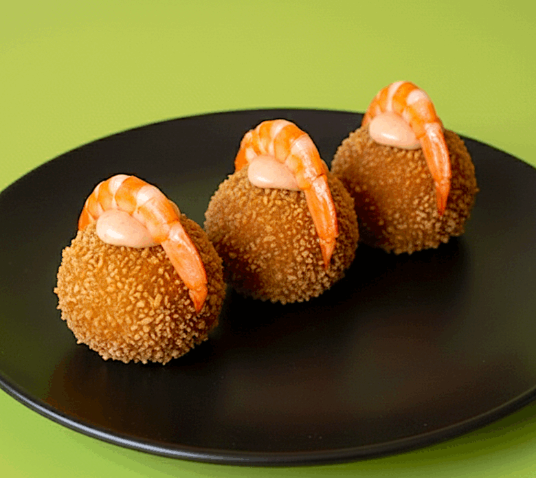 Pon un punto de salsa rosa encima de cada croqueta. Coloca una gamba encima de cada punto.