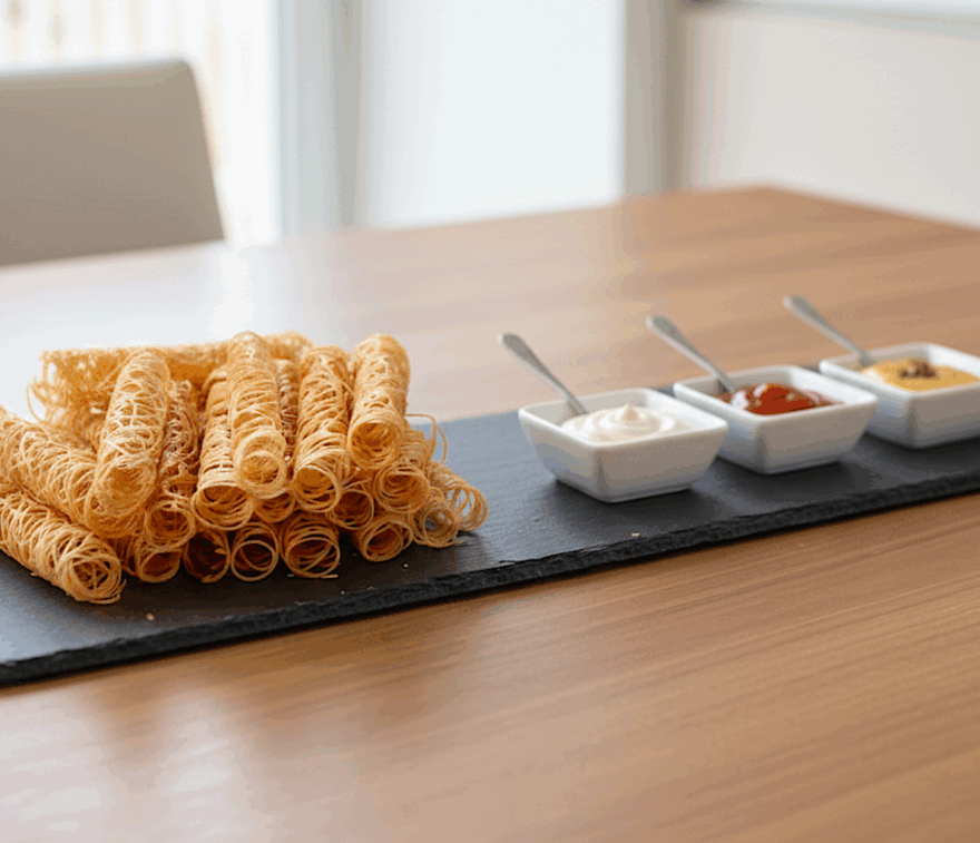 Coloca los Crujientes y Enrollados en una pizarra unos boles de salsa (mayonesa, ketchup y mostaza/miel)