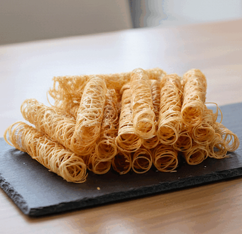 En una sartén antiadherente engrasada (repasar con un papel de cocina mojado en aceite). Vierte con ayuda del biberón la mezcla haciendo formas irregulares y abstractas, cuando empiecen a dorarse, haz unos rollos sobre sí mismos, reserva en una fuente con papel absorbente.