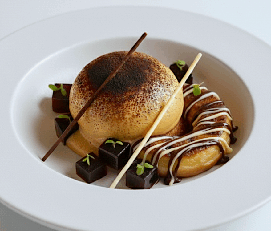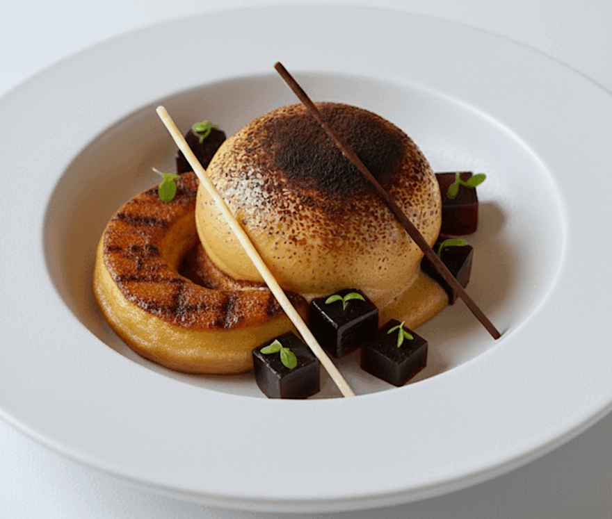 Disponer medio donut tostado en el centro de cada plato (Salsear opcionalmente el donut con chocolate blanco y negro).