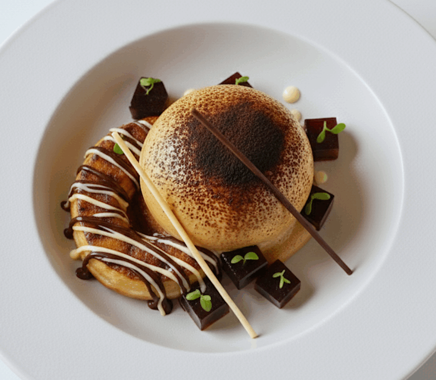 - DecoraciónAl gustoCacao en polvo, azúcar glas, menta, sticks de chocolate, salsa de chocolate...