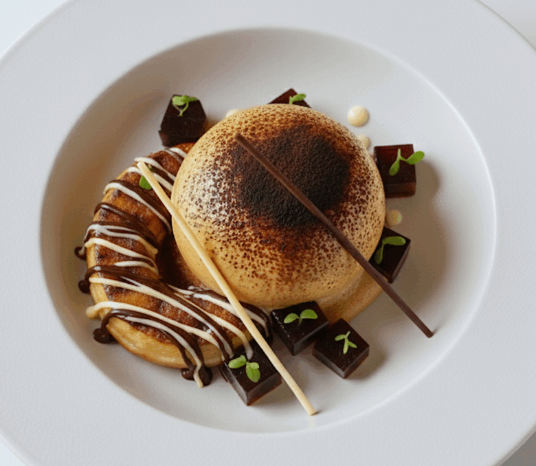 Disponer medio donut tostado en el centro de cada plato (Salsear opcionalmente el donut con chocolate blanco y negro).