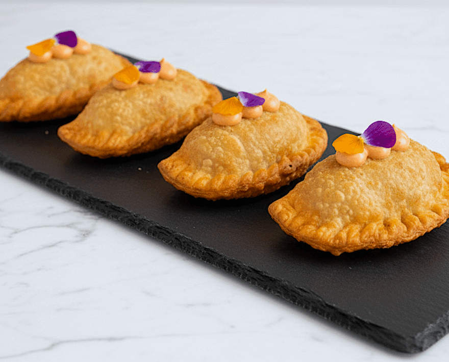 Servir las empanadillas acompañadas con salsa al parmesano con ñora y decorar con unos p´talos de flores comestibles.