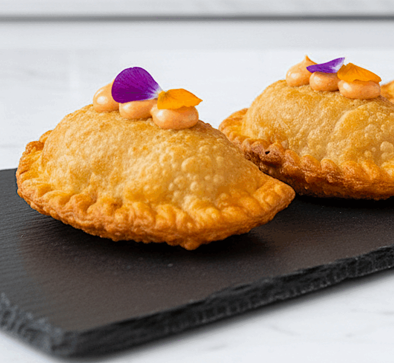 Servir las empanadillas acompañadas con salsa al parmesano con ñora y decorar con unos p´talos de flores comestibles.