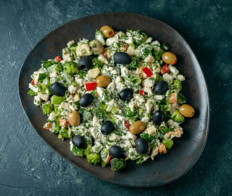 En un recipiente, mezcla el el pollo, la mitad de las aceitunas picadas, el perejil, los pimientos y el tomate.