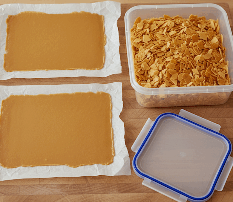 Extender muy fino con espátula sobre papel silpat o papel sulfurizado en bandejas de horno formando 2 rectángulos finos.