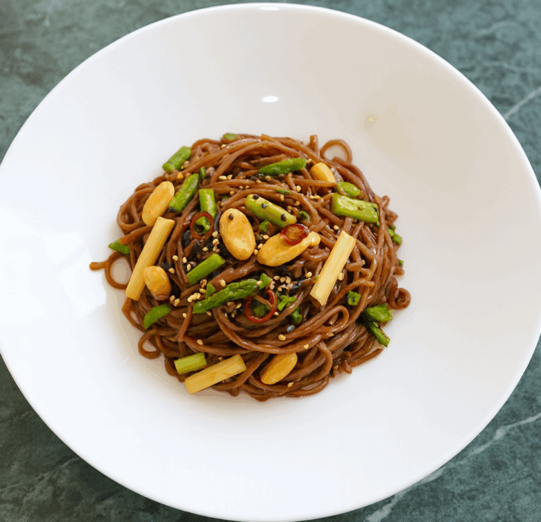 Fideos Soba Salteados con Trigueros, Cacahuetes y Salsa Sukiyaki Picante