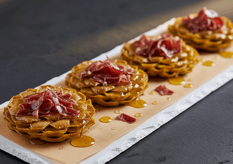 Dispón encima tiras de jamón fino y el jamón crujiente en «polvo».
