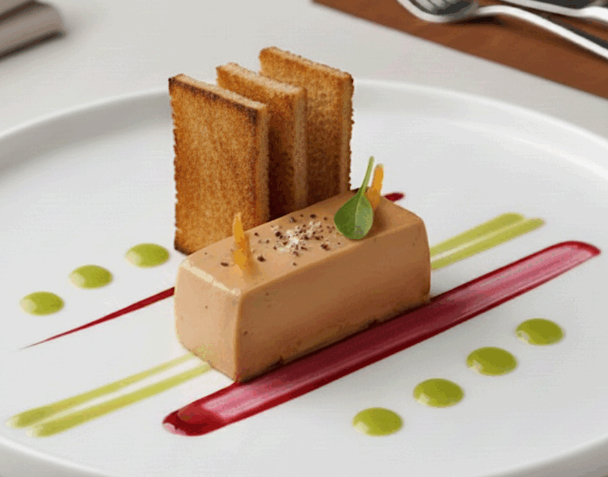 Acompañar con rebanadas de pan o brioche tostado, regañás, pan de especias suave, compota de manzana verde triturada, salsa de frutas del bosque, sal Maldon, pimientas y ralladura mínima de lima (opcional).