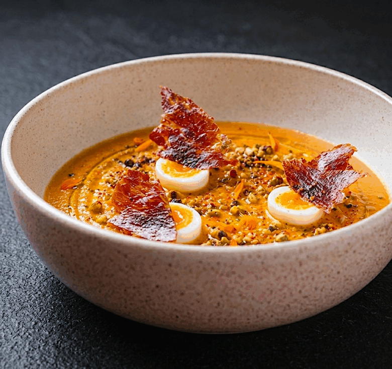Servir el gazpacho frío y espolvorear el polvo de mango y el polvo de zanahoria.