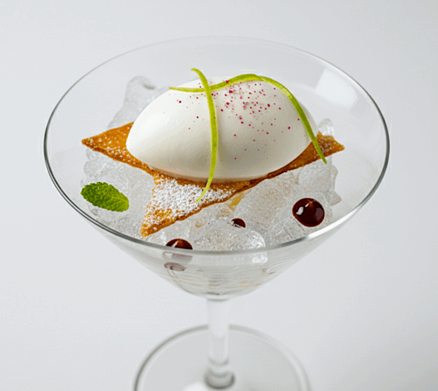 Sobre él, colocar una teja crujiente y encima una quenelle de sorbete de limón recién sacada del congelador.