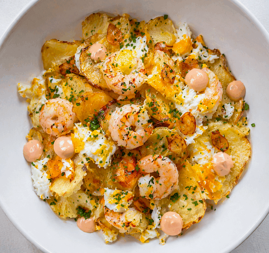 Haz una base o montaña ligera de patatas chips, encima las gambas al ajillo, colocar huevo frito. Terminar con puntos de salsa rosa y cebollino picado o perejil picado.