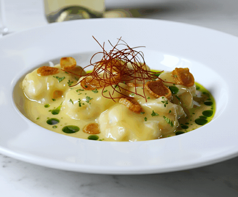 Dispón las kokotxas en el centro del plato hondo con la salsa pil-pil napando generosamente.