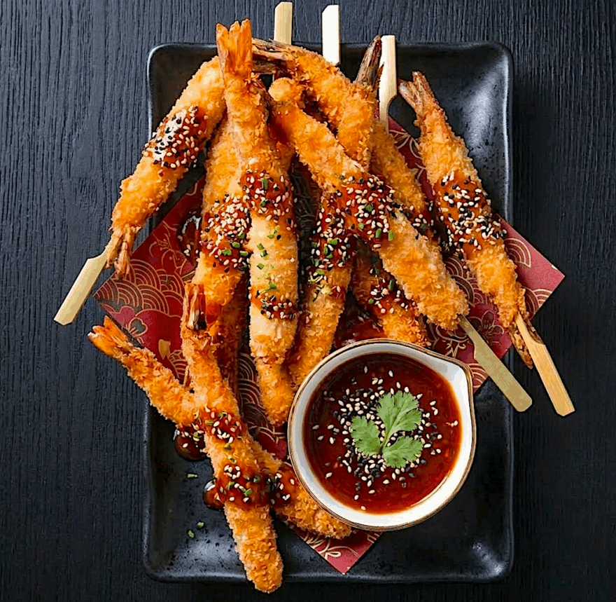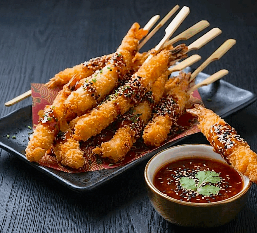 Calentar aceite a 175 °C. Freír las brochetas 2–2,5 minutos hasta un dorado intenso.