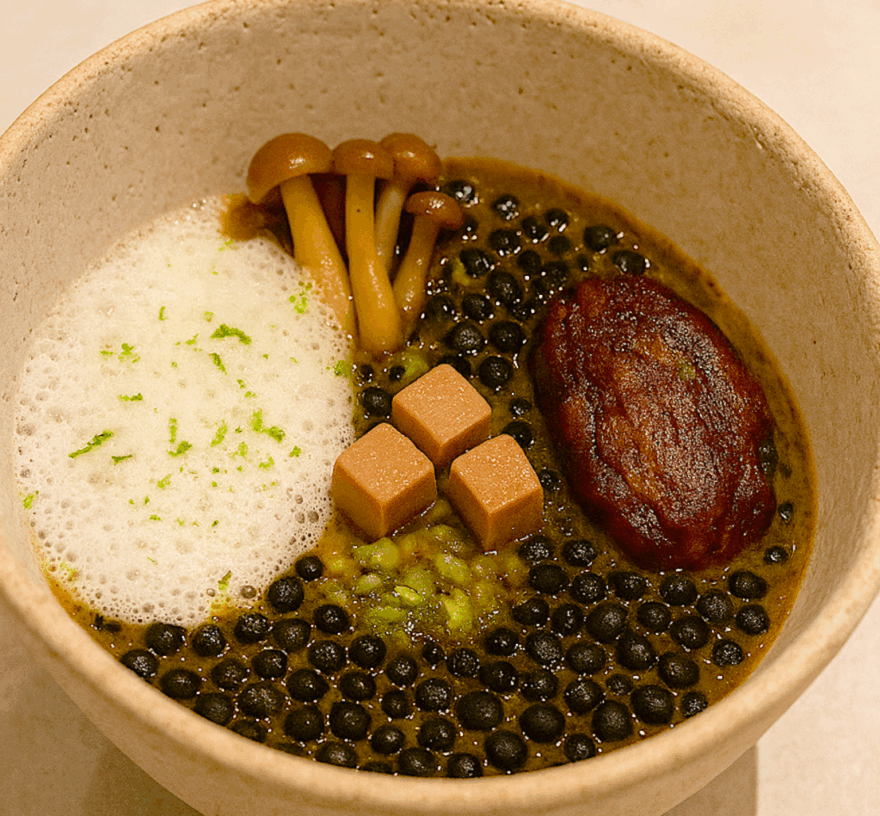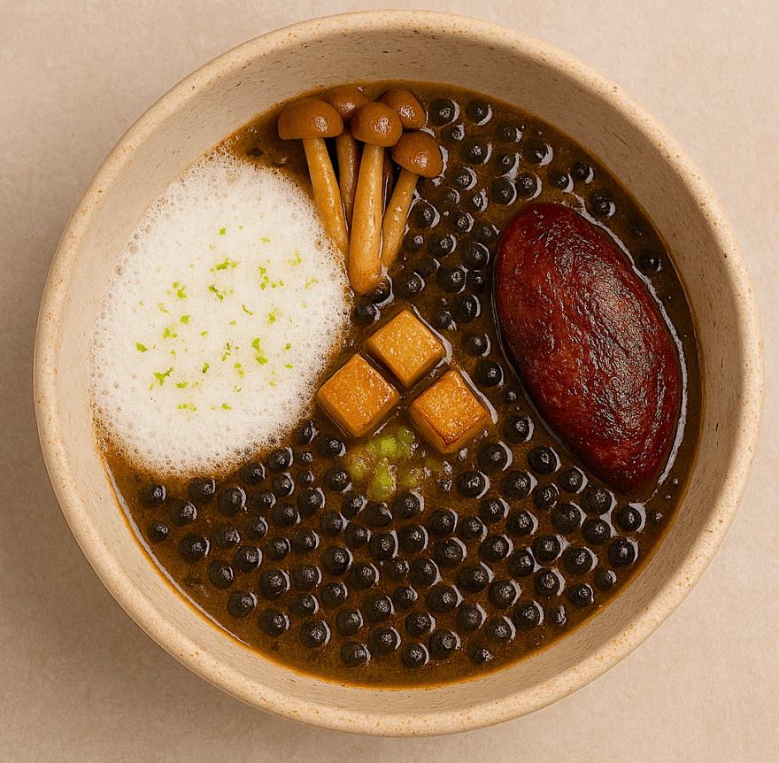 Cubrir parcialmente con el aire de coco, dejando ver las lentejas y el jamón. Rallar encima del aire piel de lima.