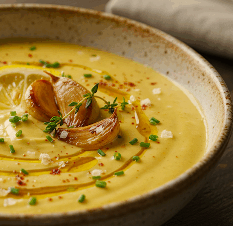 Coloca en un bol, decora con unos dientes de ajo asados, una rodaja de limón, tomillo y cebollino picado.