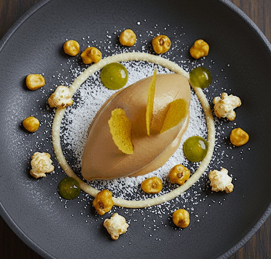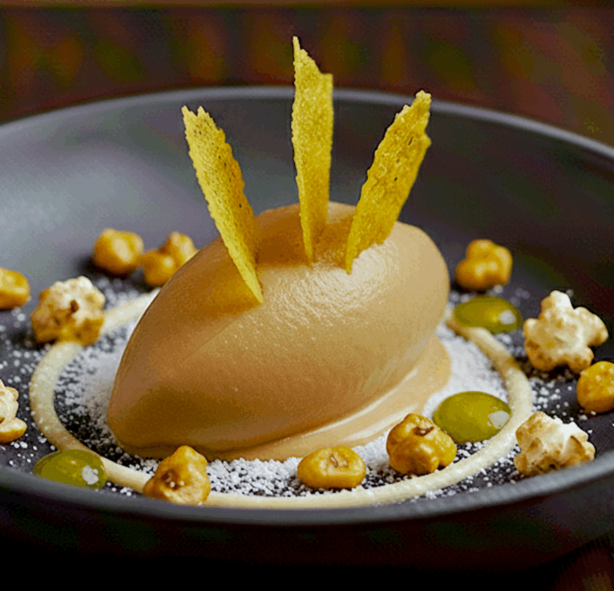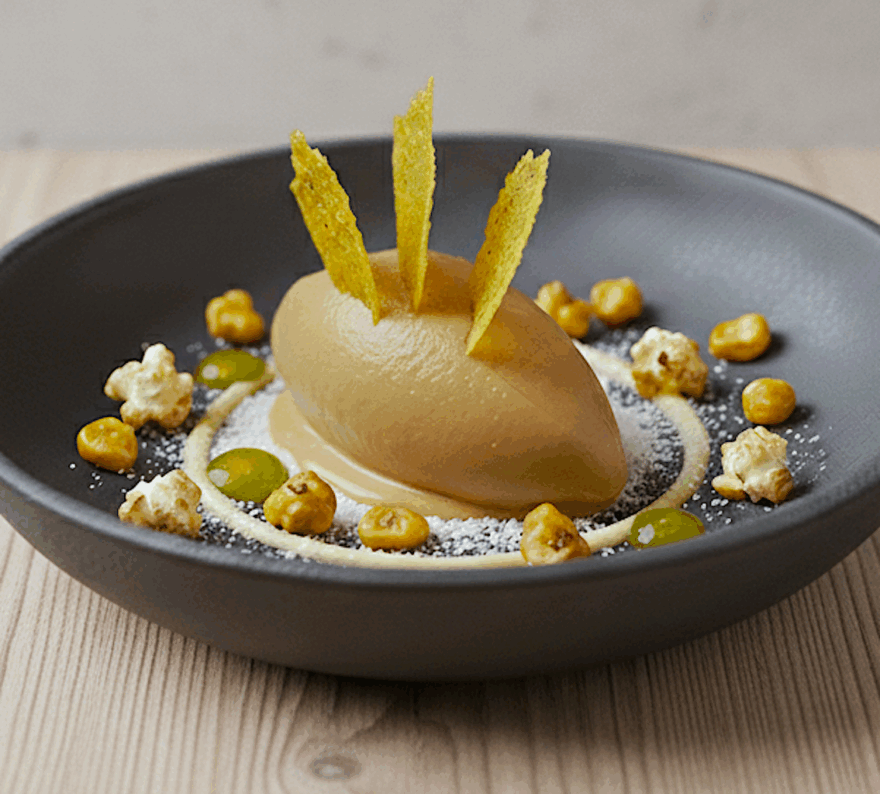 Tritura el maíz dulce con la leche condensada y el yogur, cuela y reserva en un biberón de cocina, con esto haremos el círculo de crema rodeando el helado.