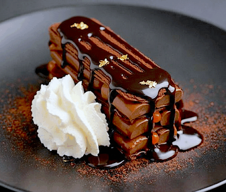 Repetir con una segunda y tercera capa. Finalizar con otra placa fina de hojaldre, espolvorear cacao, agregar un poco de sirope de chocolate y terminar con un toque de oro comestible y nata montada.