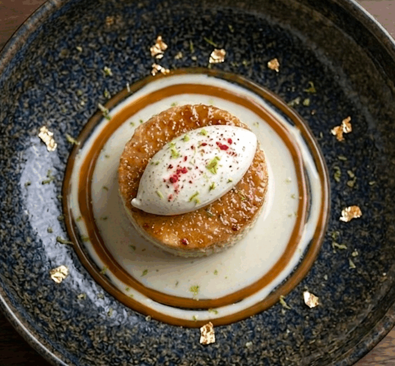 Otra opción es quitar la capa superior de nata (a la cual le podemos añadir mascarpone para hacerla más densa), agregar azúcar moreno por encima del bizcocho y con la ayuda de un soplete, caramelizar el bizcocho para después colocar la quenelle de helado.