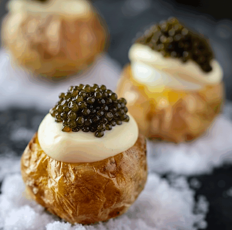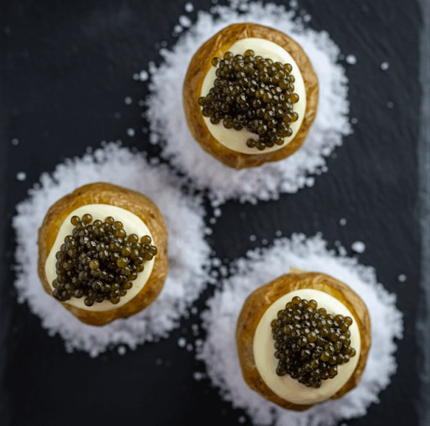En bandeja o fuente pon unos puntos de sal, encima cada patata rellena con el huevo, pon un buen punto de alioli termina con caviar siempre en frío y en el momento de comer.
