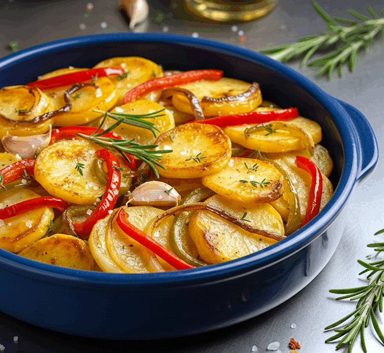 Pela las patatas y córtalas en rodajas de unos 4-5 mm de grosor. Corta la cebolla en juliana fina y los pimientos en tiras delgadas. Pela los ajos y aplástalos ligeramente (sin picar del todo).