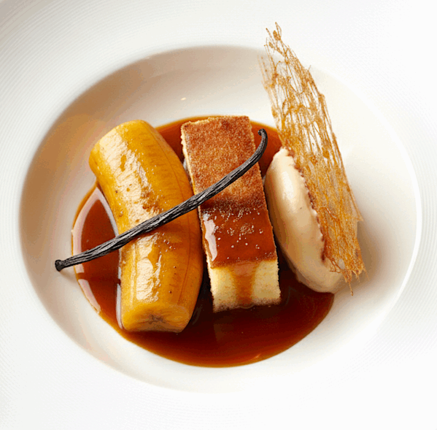 Encima o a un lado, una quenelle de helado de plátano-vainilla con un crujiente de caramelo.