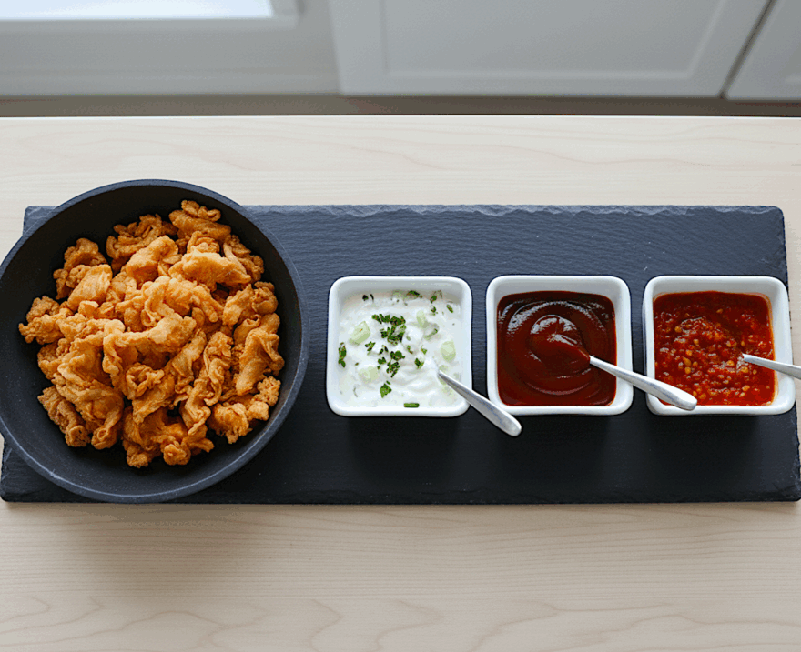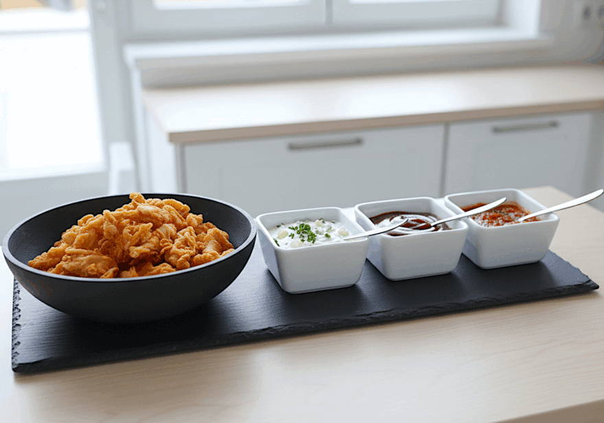 En un bol coloca los bastones de queso y acompaña con pequeños cuencos de salsa, yogur, bbq y sweet chile.