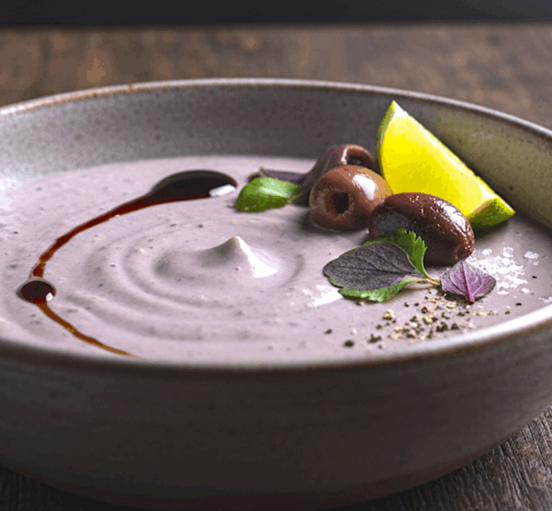 Tritura a velocidad alta hasta conseguir una salsa homogénea, cremosa y de color morado-grisáceo suave.