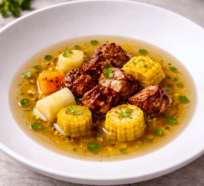 En una olla grande colocar el jarrete, la gallina y la costilla, cebolla, pimiento, puerro, zanahoria, apio, ajo, cilantro, hierbabuena, pimienta, pimientos, ají dulce