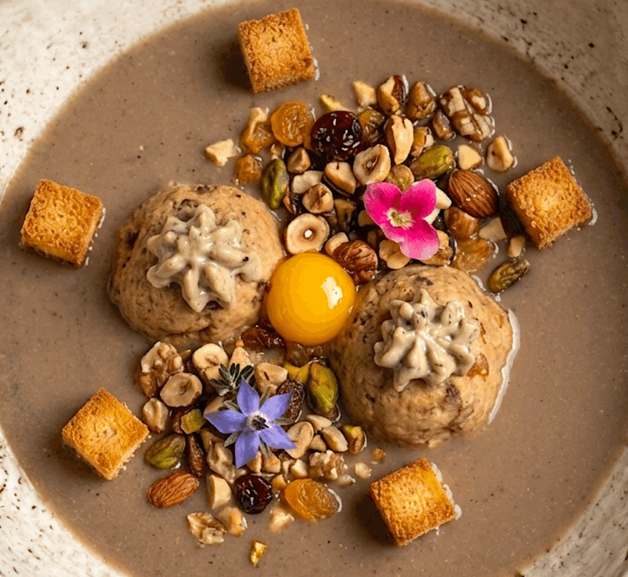 Colocar en el centro del plato o cuenco, 2–3 puntos pequeños de emulsión, encima 2-3 quenelles/bolas de carne de caza repetimos encima de cada pieza dos pequeños puntos de emulsión.
