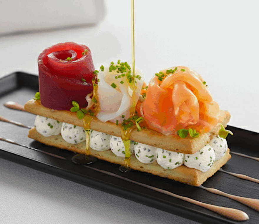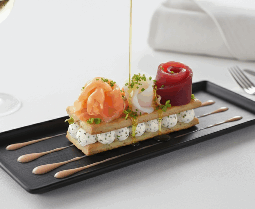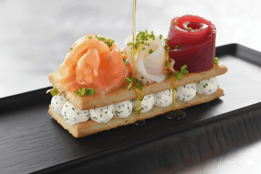 Añade otra base de pan encima. Sobre la parte superior forma una rosa de salmón, con volumen. A continuación una rosa de bacalao. Termina con una rosa de atún rojo