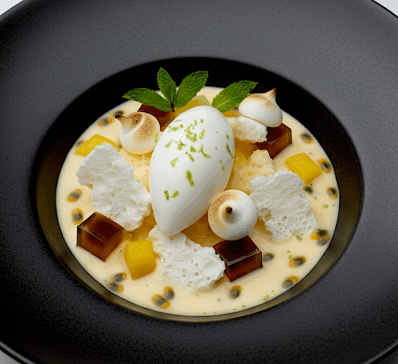 Coloca en el centro una quenelle de helado de coco y yogur.